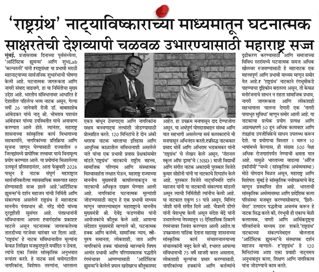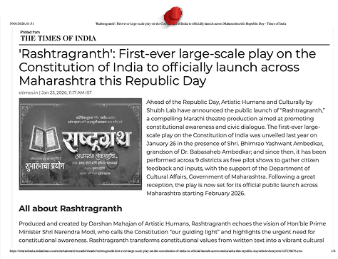 Rashtragranth is India’s first large-scale theatre play on the Constitution of India, a 120-minute immersive experience that blends art, education, and citizenship. Produced by Artistic Humans and Powered by ShubhLab, it celebrates the living spirit of democracy through stories of people who shaped and are still shaping our nation